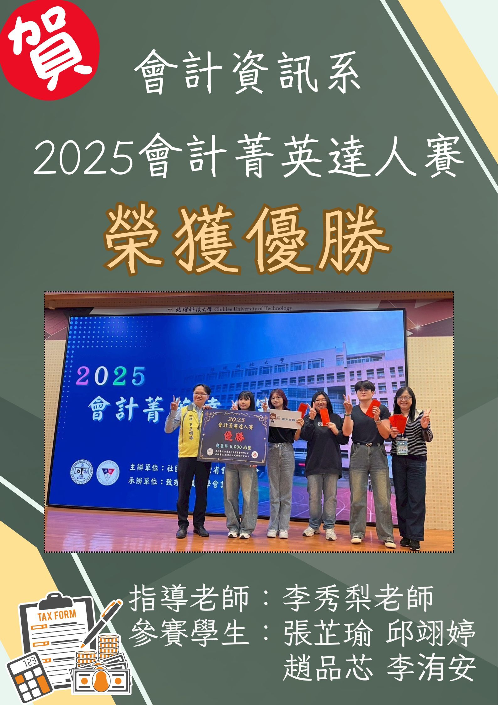 【會資系】狂賀本系李秀梨老師指導學生參加「2025會計菁英達人賽 」榮獲優勝